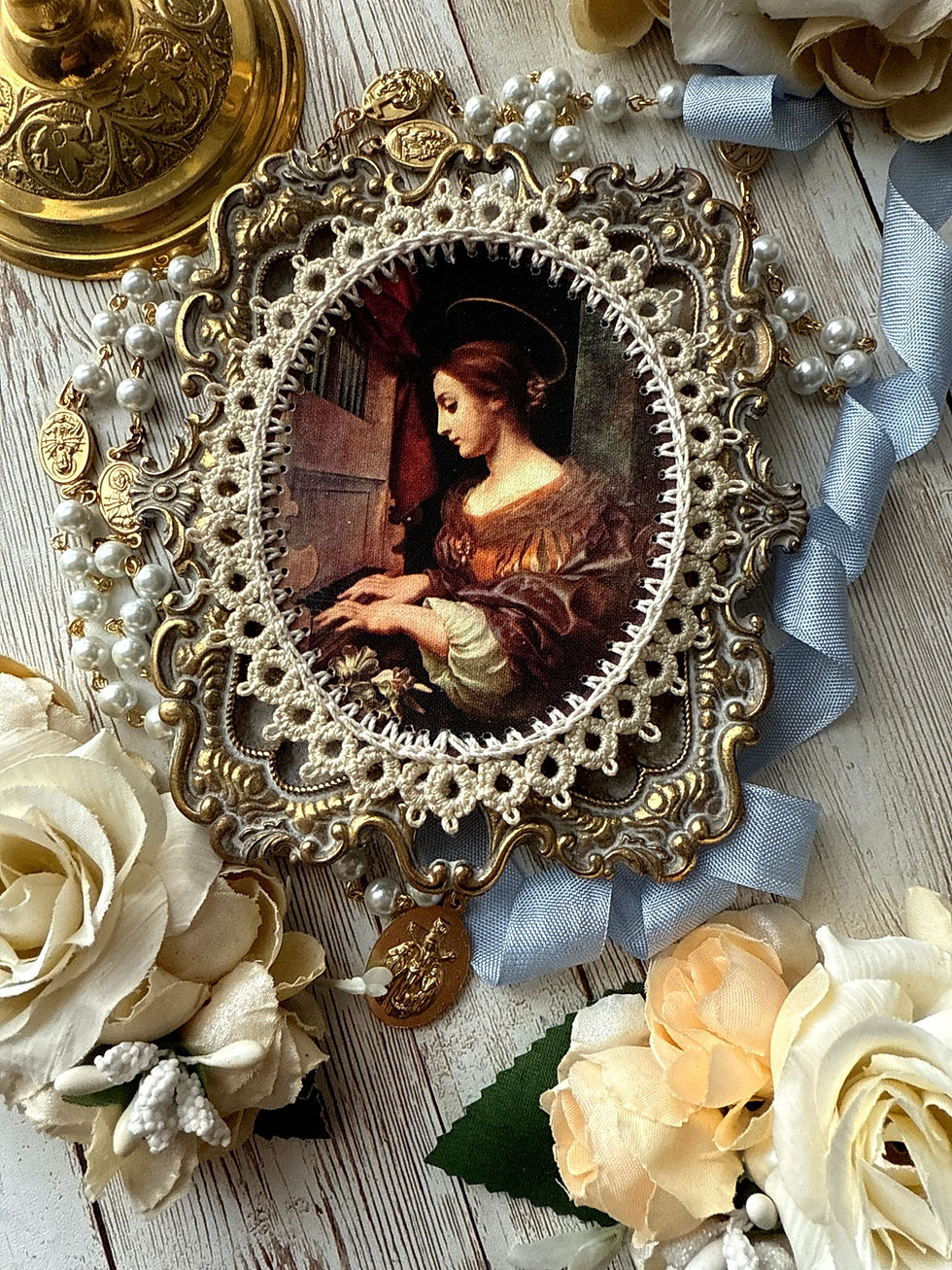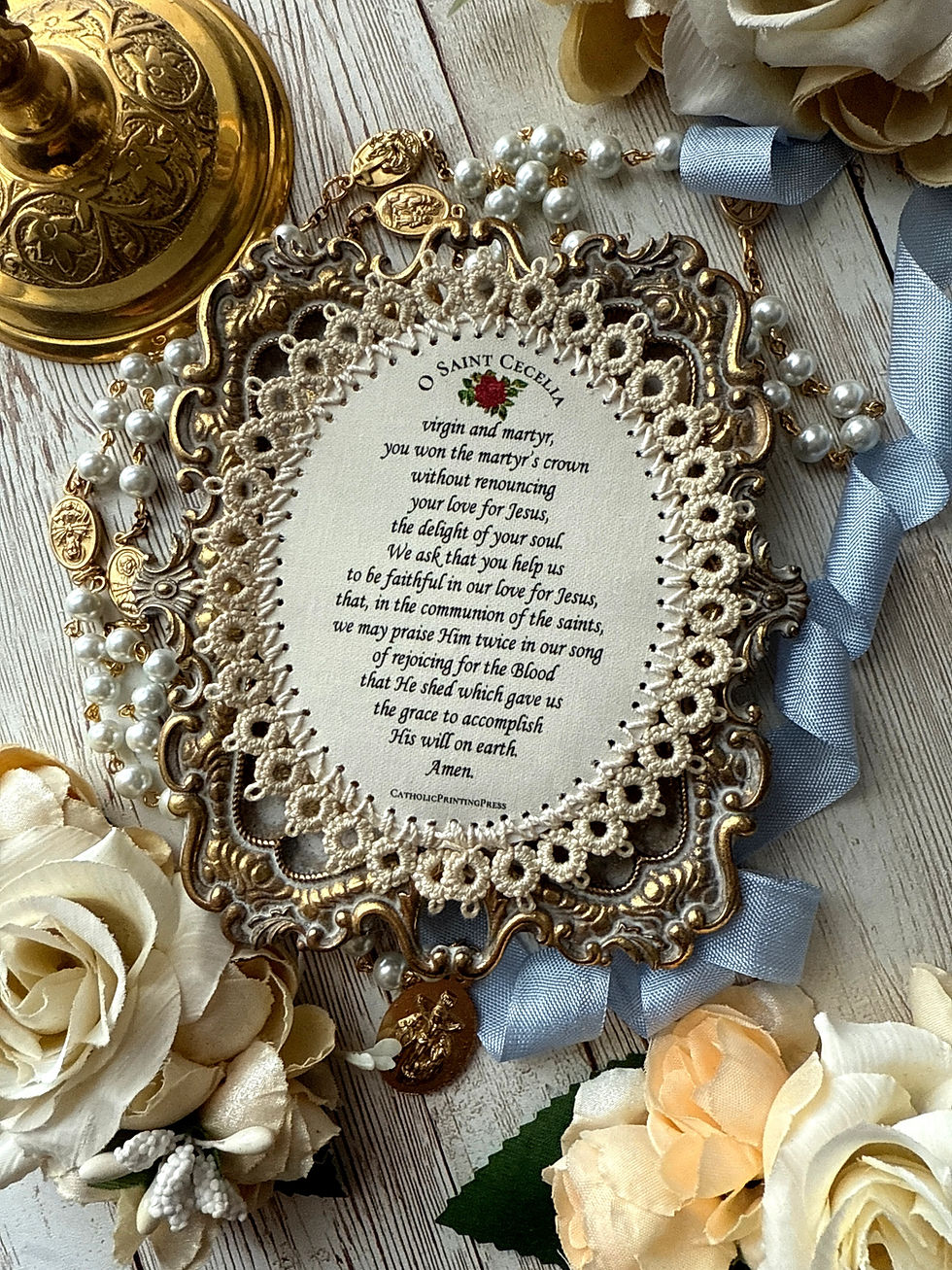 Custom Framed Personalized Fabric Lace Holy Card Detente