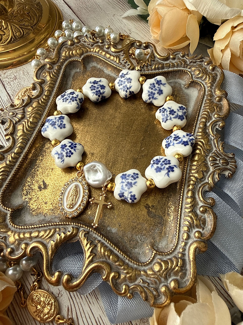 Chinoiserie Flower Catholic Rosary Bracelet